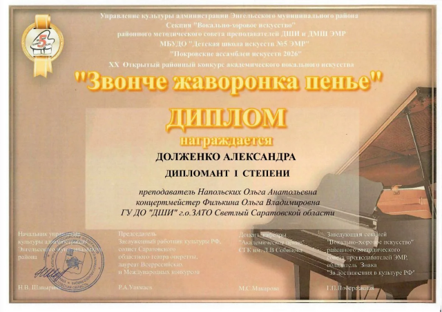 В марте этого года стали известны результаты XX Открытого районного конкурса академического вокального искусства "Звонче жаворонка пенье", проходившего в г. Энгельс в рамках "Покровских ассамблей искусств 2026".
