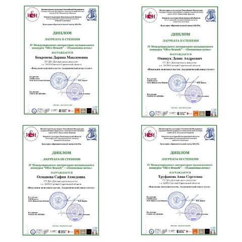 13 февраля 2025 года стали известны результаты Одиннадцатой Международной олимпиады «Музыка — душа моя!", которую проводил Свердловский мужской хоровой колледж. Учащиеся Детской школы искусств приняли участие в двух номинациях: "Музыкальный эрудит" и "Музыка глазами художника". Бекренева Дарина стала Дипломантом 1 степени (преподаватель Напольских О. А. ) Напольских Богдана Лауреатом 1 степени (преподаватель Лёсина Е.В.) |
