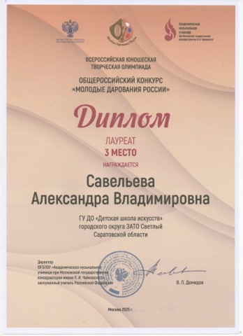 13 марта 2025 года были оглашены результаты Открытого районного конкурса академического вокального искусства «Звонче жаворонка пенье» в рамках «Покровских ассамблей искусств 2025» г. Энгельс. Учащиеся отделения "Хоровое пение" и "Любительское музицирование" (вокал) (преподаватель Напольских О. А., концертмейстеры Филькина О. В., Ерофеева Н. В.) приняли участие в конкурсе. Ребята достойно выступили и были отмечены компетентным жюри. Труфанова Анна стала Лауреатом II степени. Бекренева Дарина стала Лауреатом III степени. Османова Сафия стала Лауреатом III степени. |