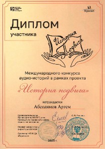 Проект "История подвига" приурочен к восьмидесятилетию победы в Великой Отечественной войне, который направлен на формирование духовно-нравственных ценностей, сохранение и углубление знаний о событиях этого нелегкого времени, формирование исторической правды. В данном проекте приняли участие: Абсолямов Артем, Анненкова Анастасия, Быкова Виктория, Васильева Любовь, Клопова Злата, Клопова Софья, Ментов Макар, Наумова Алиса. Черник Мария - ученики отделения "Искусство театра" (преподаватель Чистюхина Е.А.). В своих историях ребята повествуют о солдатах, которые не искали славы и почестей, а просто до конца исполняли свой долг перед Родиной. Ученики были награждены дипломом участника, а преподаватель Чистюхина Е.А. - благодарственным письмом. |