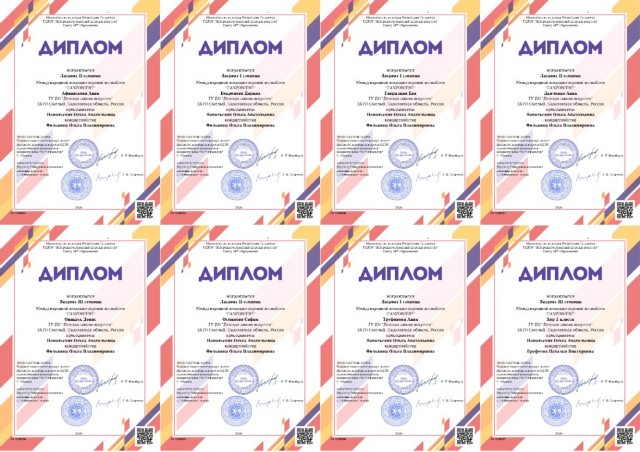 Соколова Олеся Владимировна – преподаватель отделения изобразительного искусства – награждена благодарностью министра культуры Саратовской области, Алюшев Замир Нуртдинович – преподаватель музыкального отделения – награжден Почётной грамотой главы городского округа ЗАТО Светлый, Михалкина Ольга Сергеевна – методист, Савельева Александра – обучающаяся класса саксофона, Шарнина Валерия – обучающаяся отделения изобразительного искусства – были награждены благодарственным письмом главы городского округа ЗАТО Светлый. |